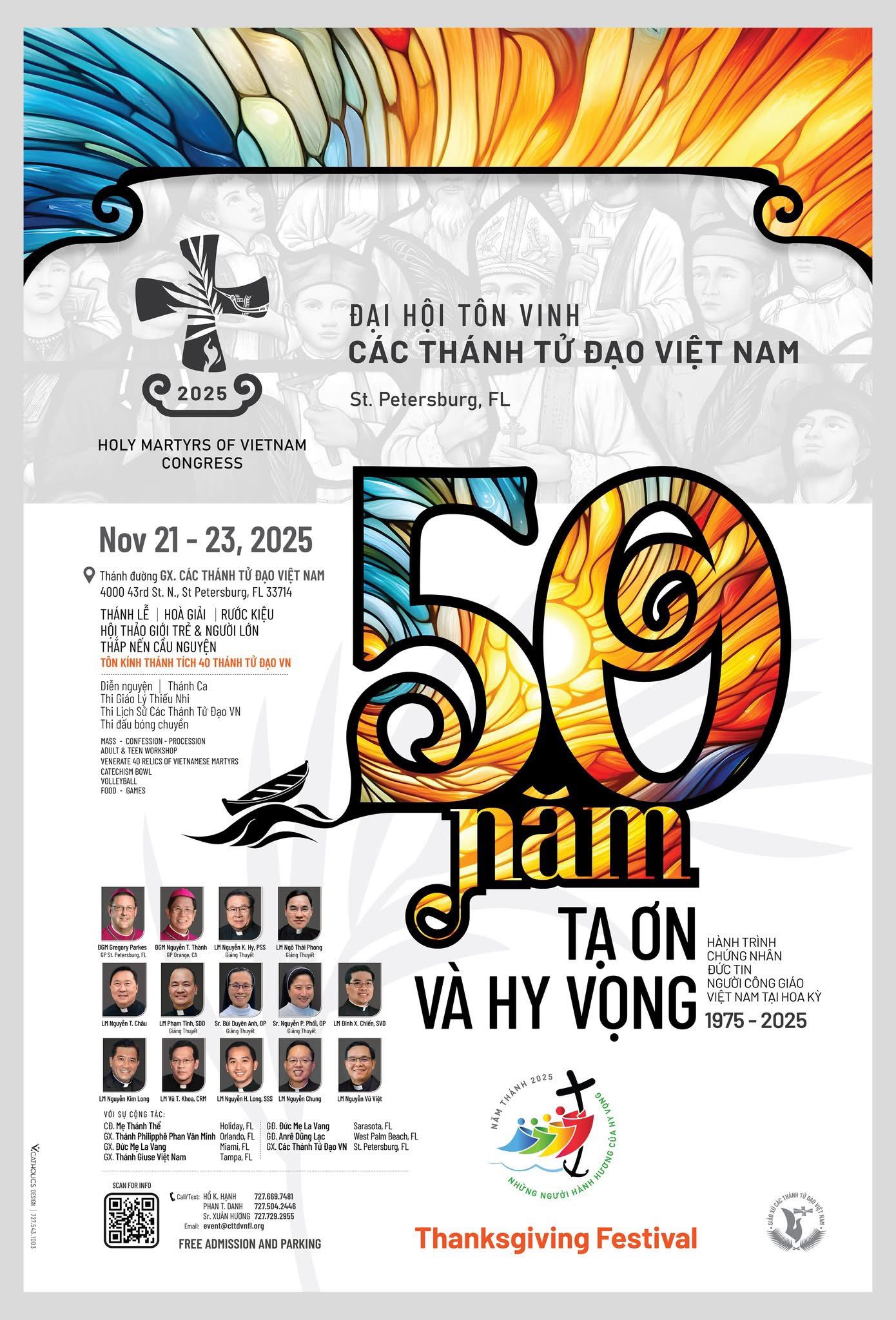 Mọi thông tin về Đại Hội Tin Vinh Các Thánh Tử Đạo Việt Nam 2025 – 50 Năm Tạ Ơn và Hy Vọng xin liên hệ: Michael Phan (727.504.2446) Hồ Kiều Hạnh (727.669.7481 Laura Bích Nguyễn (727.218.2319) Truy cập website https://daihoi.cttdvnfl.org/ để biết thêm chi tiết.