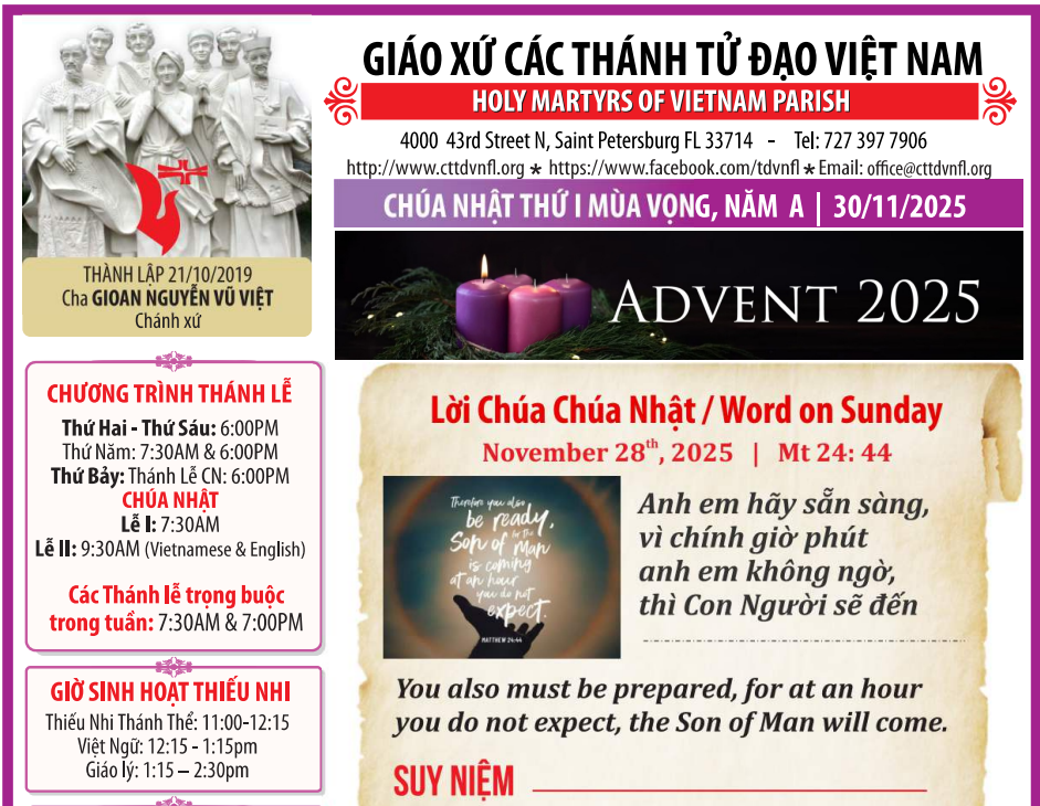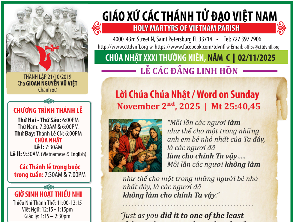 Mọi thông tin về Đại Hội Tin Vinh Các Thánh Tử Đạo Việt Nam 2025 – 50 Năm Tạ Ơn và Hy Vọng xin liên hệ: Michael Phan (727.504.2446) Hồ Kiều Hạnh (727.669.7481 Laura Bích Nguyễn (727.218.2319) Truy cập website https://daihoi.cttdvnfl.org/ để biết thêm chi tiết.